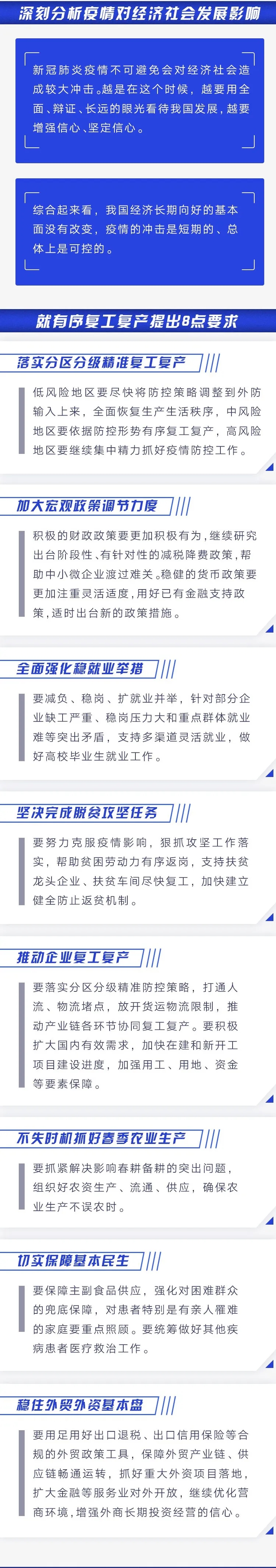 習(xí)近平指出,新冠肺炎疫情不可避免會對經(jīng)濟社會造成較大沖擊。越是在這個時候,越要用全面、辯證、長遠(yuǎn)的眼光看待我國發(fā)展,越要增強信心、堅定信心。綜合起來看,我國經(jīng)濟長期向好的基本面沒有改變,疫情的沖擊是短期的、總體上是可控的。習(xí)近平就有序復(fù)工復(fù)產(chǎn)提出8點要求。第一,落實分區(qū)分級精準(zhǔn)復(fù)工復(fù)產(chǎn)。低風(fēng)險地區(qū)要盡快將防控策略調(diào)整到外防輸入上來,全面恢復(fù)生產(chǎn)生活秩序,中風(fēng)險地區(qū)要依據(jù)防控形勢有序復(fù)工復(fù)產(chǎn),高風(fēng)險地區(qū)要繼續(xù)集中精力抓好疫情防控工作。第二,加大宏觀政策調(diào)節(jié)力度。積極的財政政策要更加積極有為,繼續(xù)研究出臺階段性、有針對性的減稅降費政策,幫助中小微企業(yè)渡過難關(guān)。穩(wěn)健的貨幣政策要更加注重靈活適度,用好已有金融支持政策,適時出臺新的政策措施。第三,全面強化穩(wěn)就業(yè)舉措。要減負(fù)、穩(wěn)崗、擴就業(yè)并舉,針對部分企業(yè)缺工嚴(yán)重、穩(wěn)崗壓力大和重點群體就業(yè)難等突出矛盾,支持多渠道靈活就業(yè),做好高校畢業(yè)生就業(yè)工作。第四,堅決完成脫貧攻堅任務(wù)。要努力克服疫情影響,狠抓攻堅工作落實,幫助貧困勞動力有序返崗,支持扶貧龍頭企業(yè)、扶貧車間盡快復(fù)工,加快建立健全防止返貧機制。第五,推動企業(yè)復(fù)工復(fù)產(chǎn)。要落實分區(qū)分級精準(zhǔn)防控策略,打通人流、物流堵點,放開貨運物流限制,推動產(chǎn)業(yè)鏈各環(huán)節(jié)協(xié)同復(fù)工復(fù)產(chǎn)。要積極擴大國內(nèi)有效需求,加快在建和新開工項目建設(shè)進(jìn)度,加強用工、用地、資金等要素保障。第六,不失時機抓好春季農(nóng)業(yè)生產(chǎn)。要抓緊解決影響春耕備耕的突出問題,組織好農(nóng)資生產(chǎn)、流通、供應(yīng),確保農(nóng)業(yè)生產(chǎn)不誤農(nóng)時。第七,切實保障基本民生。要保障主副食品供應(yīng),強化對困難群眾的兜底保障,對患者特別是有親人罹難的家庭要重點照顧。要統(tǒng)籌做好其他疾病患者醫(yī)療救治工作。第八,穩(wěn)住外貿(mào)外資基本盤。要用足用好出口退稅、出口信用保險等合規(guī)的外貿(mào)政策工具,保障外貿(mào)產(chǎn)業(yè)鏈、供應(yīng)鏈暢通運轉(zhuǎn),抓好重大外資項目落地,擴大金融等服務(wù)業(yè)對外開放,繼續(xù)優(yōu)化營商環(huán)境,增強外商長期投資經(jīng)營的信心。