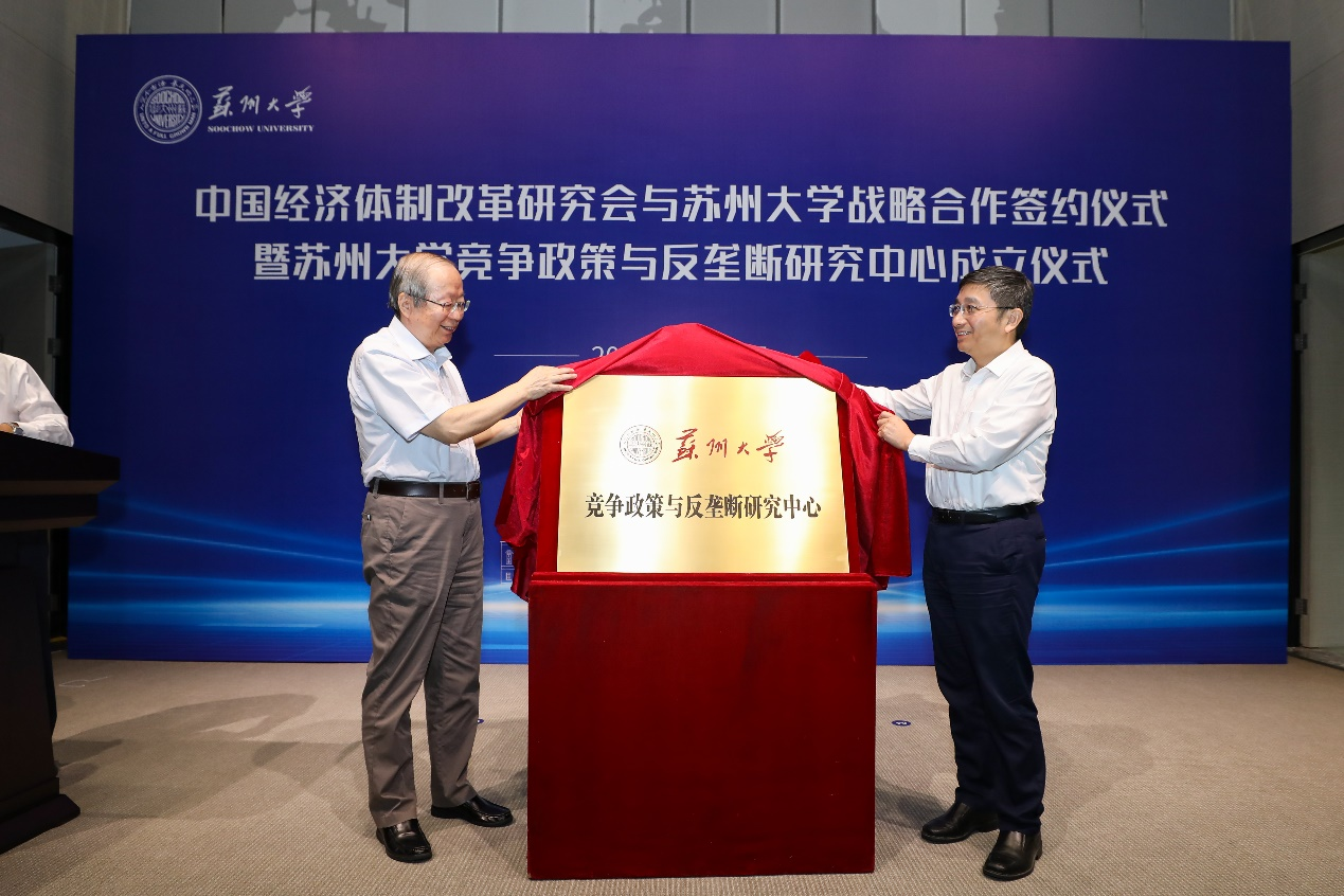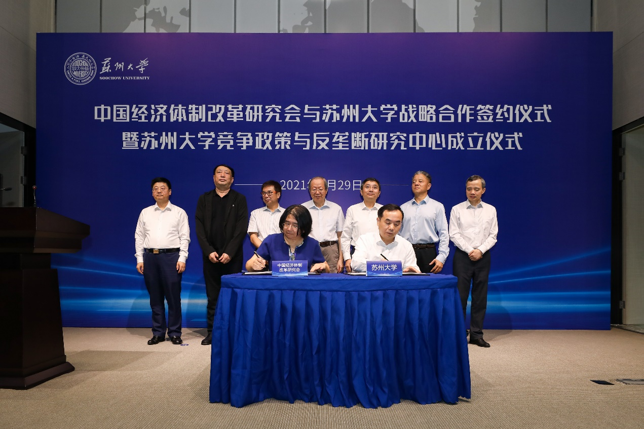 9月29日上午,彭森會長出席了中國經(jīng)濟體制改革研究會與蘇州大學共同舉辦的戰(zhàn)略合作協(xié)議簽署暨蘇州大學競爭政策與反壟斷研究中心揭牌儀式。蘇州大學黨委書記江涌代表蘇州大學致歡迎辭,彭森會長、江蘇省市場監(jiān)管局陳琪宏副局長、蘇州市副市長楊知評為會議致辭。