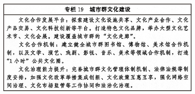 加強(qiáng)區(qū)域文化協(xié)同創(chuàng)新,健全合作互助、扶持補(bǔ)償機(jī)制,推動(dòng)?xùn)|部地區(qū)以創(chuàng)新引領(lǐng)文化發(fā)展,加大力度支持中西部地區(qū)以及東北等老工業(yè)基地文化發(fā)展,扶持革命老區(qū)、民族地區(qū)、邊疆地區(qū)文化發(fā)展,形成相互促進(jìn)、優(yōu)勢(shì)互補(bǔ)、融合互動(dòng)的區(qū)域文化發(fā)展格局。圍繞京津冀協(xié)同發(fā)展、長江經(jīng)濟(jì)帶發(fā)展、粵港澳大灣區(qū)建設(shè)、長三角一體化發(fā)展、黃河流域生態(tài)保護(hù)和高質(zhì)量發(fā)展等區(qū)域重大戰(zhàn)略,健全推進(jìn)區(qū)域內(nèi)文化協(xié)同發(fā)展機(jī)制,提升公共文化設(shè)施互聯(lián)互通水平,加強(qiáng)區(qū)域文化產(chǎn)業(yè)帶建設(shè),實(shí)現(xiàn)區(qū)域文化建設(shè)水平整體提高。促進(jìn)形成文化產(chǎn)業(yè)發(fā)展新格局,創(chuàng)新城市群文化一體化發(fā)展體制機(jī)制,共建高水平合作平臺(tái),加強(qiáng)公共文化服務(wù)便利共享。完善以城帶鄉(xiāng)、城鄉(xiāng)融合的文化發(fā)展體制機(jī)制,發(fā)揮城市帶動(dòng)輻射作用,加快城鄉(xiāng)間文化要素雙向流動(dòng),形成以點(diǎn)帶面、特色鮮明、優(yōu)勢(shì)互補(bǔ)、均衡配置的城鄉(xiāng)文化發(fā)展新格局。