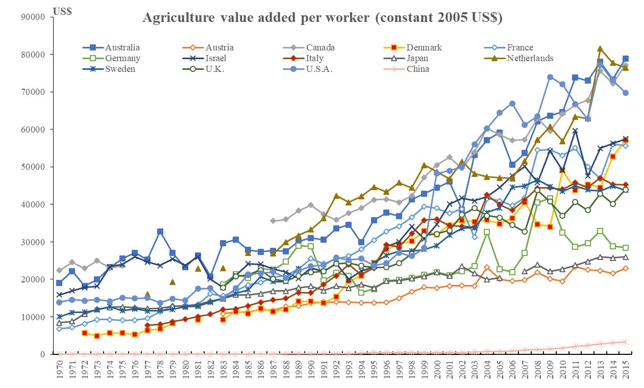如圖5,西方城市化過程中兩個收入差距的縮小在中國沒有出現(xiàn)。中國在最快速城市化階段出現(xiàn)了城鄉(xiāng)收入差距拉大,第一是我們只有快速城市化,但沒有城鄉(xiāng)融合。第二是我們城市化的模式是回村的城市化模式。在城市里干工作,干到一定程度再回到農(nóng)村,這是全世界沒有的。第三是農(nóng)業(yè)競爭力下降?,F(xiàn)在一定要有一個認(rèn)識,農(nóng)業(yè)的份額降到10%以后,各個國家的農(nóng)業(yè)到底在干什么?我們現(xiàn)在想到農(nóng)業(yè)到10%,再到2%、1%,農(nóng)業(yè)就可有可無了,這種觀點是錯誤的。所有國家的農(nóng)業(yè)在降到10%以后,農(nóng)業(yè)在變強(qiáng),它的農(nóng)業(yè)和原來的農(nóng)業(yè)完全不一樣。中國由于單向城市化的模式,最后農(nóng)業(yè)競爭力進(jìn)一步下降。(如圖6)我們現(xiàn)在只有6%、7%的農(nóng)業(yè),這個農(nóng)業(yè)的競爭力是下降的,背后是農(nóng)業(yè)成本上升,所有成本都在上升。