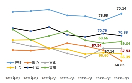 從改革熱度指數(shù)的六大領域來看,經(jīng)濟領域75.14,政治領域64.85,文化領域67.53,社會領域66.39,生態(tài)領域70.33,黨建領域69.04。與上一季度相比,經(jīng)濟、黨建領域上升。