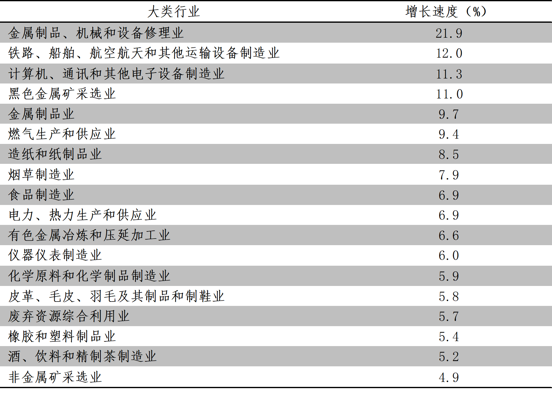 8月份,增長速度超過規(guī)模以上工業(yè)增長4.5%的主要大類行業(yè)共有18個(gè),即金屬制品、機(jī)械和設(shè)備修理業(yè)同比增長21.9%,鐵路、船舶、航空航天和其他運(yùn)輸設(shè)備制造業(yè)增長12.0%,計(jì)算機(jī)、通訊和其他電子設(shè)備制造業(yè)增長11.3%,黑色金屬礦采選業(yè)增長11.0%,金屬制品業(yè)增長9.7%,燃?xì)馍a(chǎn)和供應(yīng)業(yè)增長9.4%,造紙和紙制品業(yè)增長8.5%,煙草制造業(yè)增長7.9%,食品制造業(yè)增長6.9%,電力、熱力生產(chǎn)和供應(yīng)業(yè)增長6.9%,有色金屬冶煉和壓延加工業(yè)增長6.6%,儀器儀表制造業(yè)增長6.0%,化學(xué)原料和化學(xué)制品制造業(yè)增長5.9%,皮革、毛皮、羽毛及其制品和制鞋業(yè)增長5.8%,廢棄資源綜合利用業(yè)增長5.7%,橡膠和塑料制品業(yè)增長5.4%,酒飲料和精制茶制造業(yè)增長百分之5.2%,非金屬礦采選業(yè)增長4.9%。