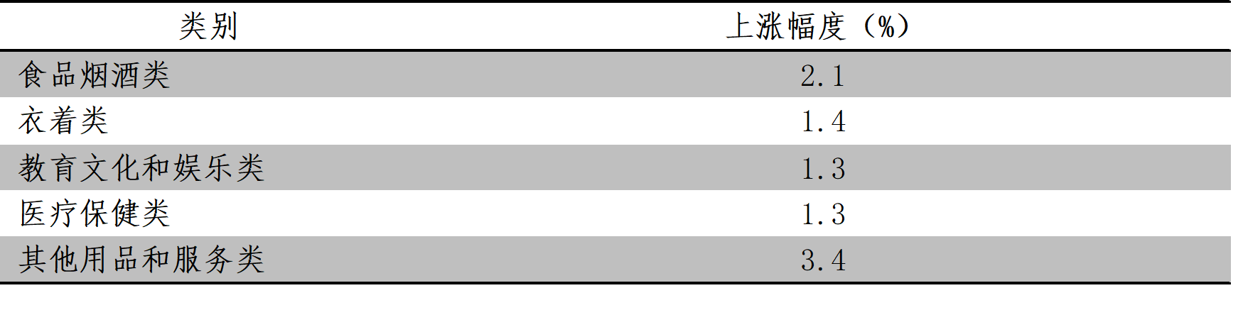 漲幅超過CPI同比上漲0.6%的類別共有5類,即食品煙酒類價(jià)格同比上漲2.1%,衣著類上漲1.4%,教育文化和娛樂類上漲1.3%,醫(yī)療保健類上漲1.3%,其他用品和服務(wù)類上漲3.4%。