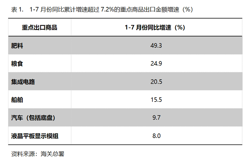1-7月份,出口金額同比增速超過(guò)7.3%的重點(diǎn)商品共有6類,即肥料出口增長(zhǎng)49.3%,糧食增長(zhǎng)24.9%,集成電路增長(zhǎng)20.5%,船舶增長(zhǎng)15.5%,汽車(包括底盤)增長(zhǎng)9.7%,液晶平板顯示模組增長(zhǎng)8.0%。