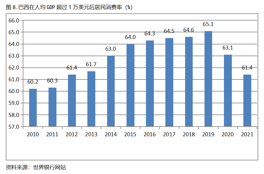 巴西在人均GDP超過1萬美元后的12年期間,居民消費(fèi)率基本上保持在60.0%以上,也呈現(xiàn)出較長(zhǎng)時(shí)間的提高,但后兩年也出現(xiàn)小幅的回落。巴西在2010年人均GDP超過1萬美元,當(dāng)年居民消費(fèi)率為60.2%,2019提高到65.1%,隨后兩年出現(xiàn)回落,2021年為61.4%,也就是說,巴西在人均GDP超過1萬美元后的12年期間,居民消費(fèi)率由當(dāng)年的60.2%提高到2019年最高的65.1%,共提高了4.9個(gè)百分點(diǎn)。