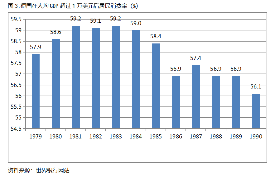 德國(guó)在人均GDP超過1萬美元后的12年期間,居民消費(fèi)率一直保持在56.0%以上,同時(shí)還呈現(xiàn)出先提高后回落總體穩(wěn)定的趨勢(shì)。德國(guó)在1979年人均GDP超過1萬美元,當(dāng)年居民消費(fèi)率為57.9%,1981年提高到59.2%,隨后又有所回落,1990年為56.1%,也就是說,德國(guó)在人均GDP超過1萬美元后的12年期間,居民消費(fèi)率由當(dāng)年的57.9%提高到1981年最高的59.2%,共提高了1.3個(gè)百分點(diǎn)。
