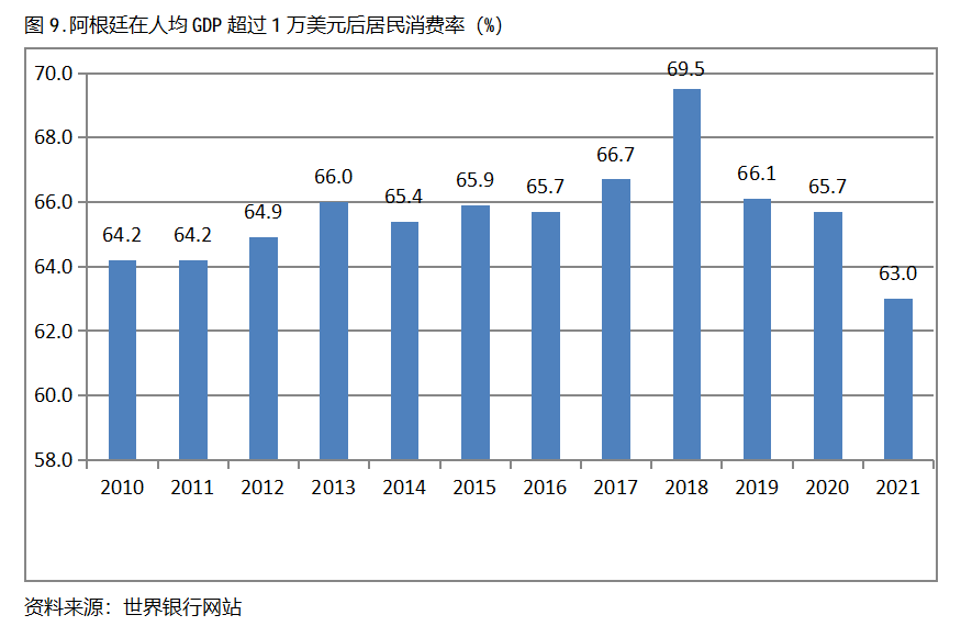 阿根廷在人均GDP超過1萬美元后的12年期間,居民消費(fèi)率基本上保持在63.0%以上,也呈現(xiàn)出較長(zhǎng)時(shí)間的提高,但后幾年也出現(xiàn)小幅的回落。阿根廷在2010年人均GDP超過1萬美元,當(dāng)年居民消費(fèi)率為64.2%,2018提高到69.5%,隨后兩年出現(xiàn)回落,2021年為63.0%,也就是說,阿根廷在人均GDP超過1萬美元后的12年期間,居民消費(fèi)率由當(dāng)年的64.2%提高到2018年最高的69.5%,共提高了5.3個(gè)百分點(diǎn)。