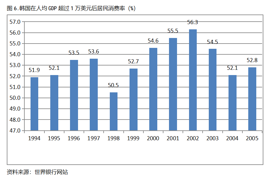 韓國(guó)在人均GDP超過1萬美元后的12年期間,居民消費(fèi)率一直保持在50.0%以上,呈現(xiàn)出較長(zhǎng)時(shí)間的提高,但后幾年出現(xiàn)小幅的回落。韓國(guó)在1994年人均GDP超過1萬美元,當(dāng)年居民消費(fèi)率為51.9%,2002提高到56.3%,隨后出現(xiàn)回落,2005年為52.8%,也就是說,韓國(guó)在人均GDP超過1萬美元后的12年期間,居民消費(fèi)率由當(dāng)年的51.9%提高到2002年最高的56.3%,共提高了4.4個(gè)百分點(diǎn)。