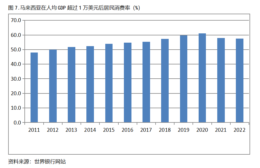 馬來西亞在人均GDP超過1萬美元后的12年期間,居民消費(fèi)率基本上保持在50.0%以上,也呈現(xiàn)出較長(zhǎng)時(shí)間的提高,但后幾年也出現(xiàn)小幅的回落。馬來西亞在2011年人均GDP超過1萬美元,當(dāng)年居民消費(fèi)率為48.0%,2020提高到61.0%,隨后出現(xiàn)回落,2022年為57.6%,也就是說,馬來西亞在人均GDP超過1萬美元后的12年期間,居民消費(fèi)率由當(dāng)年的48.0%提高到2020年最高的61.0%,共提高了13.0個(gè)百分點(diǎn)。