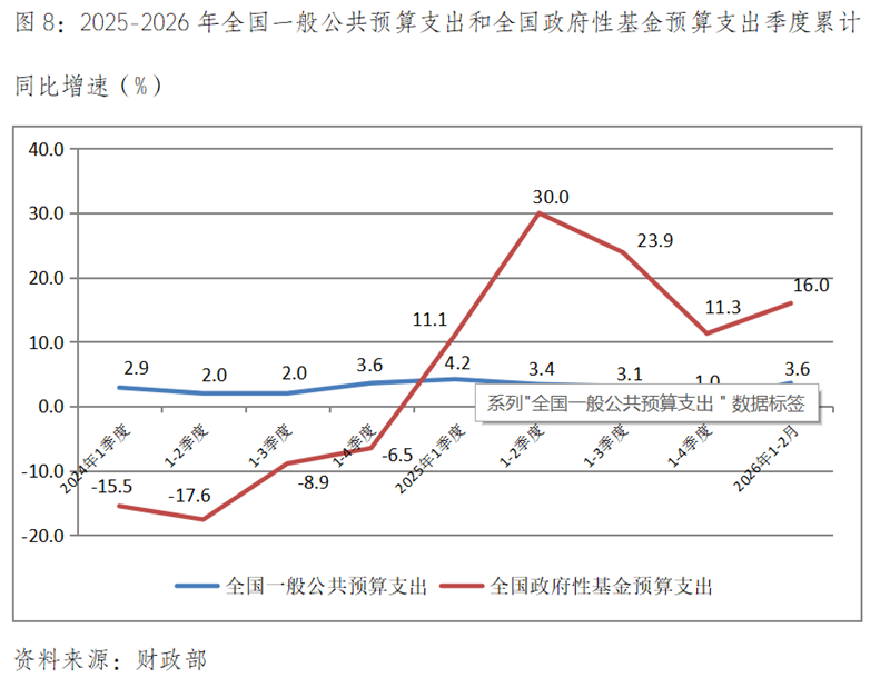 (四)一般公共預(yù)算支出和政府性基金預(yù)算支出增速均比上年全年回升,比上年同期有落有升。1-2月份全國(guó)一般公共預(yù)算支出同比增長(zhǎng)3.6%,比上年全年增長(zhǎng)1.0%回升2.6個(gè)百分點(diǎn),比上年同期增長(zhǎng)4.2%回落了0.6個(gè)百分點(diǎn);全國(guó)政府性基金預(yù)算支出同比增長(zhǎng)16.0%,比上年全年增長(zhǎng)11.3%回升5.7個(gè)百分點(diǎn),比上年同期增長(zhǎng)11.1%回升了5.9個(gè)百分點(diǎn)。需要關(guān)注的是1-2月份一般公共預(yù)算支出增速低于全年預(yù)算4.4%的增速,存在著加快一般公共預(yù)算支出進(jìn)度的需要。