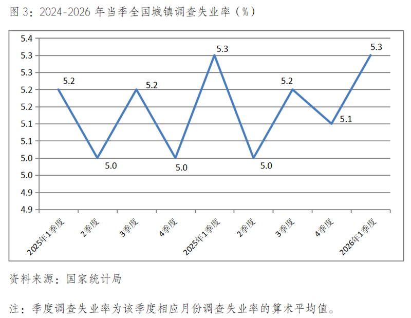 (三)調(diào)查失業(yè)率比上年四季度回升,與上年同期持平。一季度平均調(diào)查失業(yè)率為5.3%,比上年四季度的5.1%回升0.2個(gè)百分點(diǎn);與上年同期的5.3%持平,其中1月份為5.2%,2月份為5.3%,3月份為5.4%,總體上保持了基本穩(wěn)定的態(tài)勢(shì)。