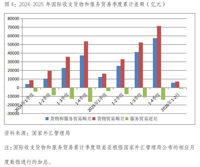 國(guó)際收支貨物和服務(wù)順差中,貨物貿(mào)易繼續(xù)保持順差,服務(wù)貿(mào)易仍然保持逆差。1月份國(guó)際收支貨物貿(mào)易順差6342億元,服務(wù)貿(mào)易逆差1631億元;2月份國(guó)際收支貨物貿(mào)易順差4638億元,服務(wù)貿(mào)易逆差1178億元。在國(guó)際環(huán)境趨于更加復(fù)雜嚴(yán)峻形勢(shì)下,國(guó)際收支貨物和服務(wù)貿(mào)易仍實(shí)現(xiàn)較大順差,充分說(shuō)明我國(guó)經(jīng)濟(jì)有著較強(qiáng)的韌性和回旋空間。