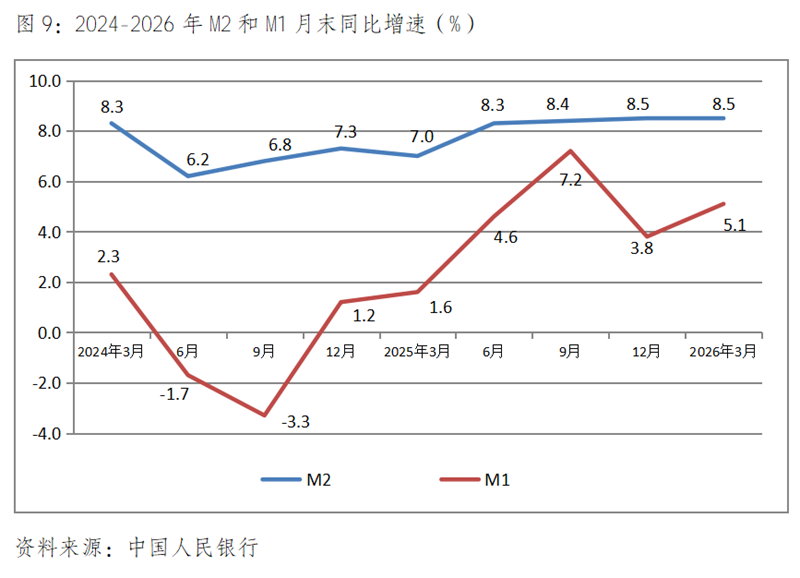 (五)廣義貨幣供應(yīng)量(M2)增速與上年年底持平,比上年同期回升。3月末,廣義貨幣供應(yīng)量同比增長(zhǎng)8.5%,與上年年底增長(zhǎng)8.5%持平,比上年同期增長(zhǎng)7.0%回升1.5個(gè)百分點(diǎn);3月末,狹義貨幣供應(yīng)量同比增長(zhǎng)5.1%,比上年年底增長(zhǎng)3.8%回升了1.3個(gè)百分點(diǎn),比上年同期增長(zhǎng)1.6%回升3.5個(gè)百分點(diǎn)。但M1增速比M2增速慢的點(diǎn)數(shù),雖然比上年年底和上年同期有所縮小,但3月末仍差3.4個(gè)百分點(diǎn),同時(shí)3月末金融機(jī)構(gòu)人民幣貸款余額同比增長(zhǎng)5.7%,比存款余額同比增長(zhǎng)8.6%慢不少,慢2.9個(gè)百分點(diǎn)。