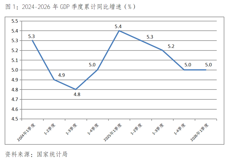 (一)GDP增速與上年全年持平,比上年同期回落。一季度GDP同比增長(zhǎng)5.0%,與上年全年增長(zhǎng)5.0%持平,比上年同期增長(zhǎng)5.4%回落了0.4個(gè)百分點(diǎn)。與上年同期相比,第一產(chǎn)業(yè)增速回升,第一產(chǎn)業(yè)增長(zhǎng)3.8%,比上年同期增長(zhǎng)3.5%回升0.3個(gè)百分點(diǎn);第二產(chǎn)業(yè)和第三產(chǎn)業(yè)增速回落,第二產(chǎn)業(yè)增長(zhǎng)4.9%,比上年同期增長(zhǎng)5.9%回落1.0個(gè)百分點(diǎn);第三產(chǎn)業(yè)增長(zhǎng)5.2%,比上年同期增長(zhǎng)5.3%回落0.1個(gè)百分點(diǎn)。